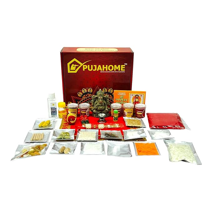 •  Includes 32 Must-Have Pooja Items for Ganesh Chaturthi Each kit contains a combination of handpicked, authentic items such as roli, akshat, supari, janeu, chandan, durva grass, kapur, haldi, kumkum, gulal, and more – everything needed for Ganesh Sthapana, daily puja, or visarjan rituals.